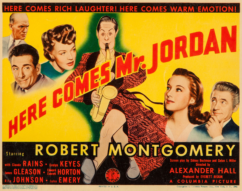 HERE COMES MR. JORDAN (Columbia, 1941) DIR Alexander Hall PROD Everett Riskin SCR Seton I. Miller, Sidney Buchman (play ‘Heaven Can Wait’ by Harry Segall) CAST Robert Montgomery, Evelyn Keyes (Bette Logan), Claude Rains, Rita Johnson, Edward Everett Horton, James Gleason