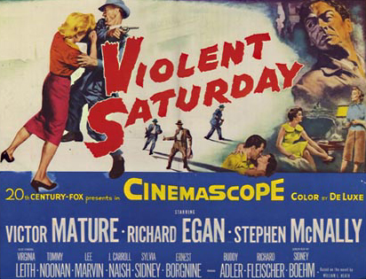 VIOLENT SATURDAY (20th Century Fox, 1955) DIR Richard Fleischer PROD Buddy Adler SCR Sidney Boehm (novel ‘Violent Saturday’ [1955] by William L. Heath) CAST Victor Mature, Richard Egan, Stephen McNally, Virginia Leith, Lee Marvin, Sylvia Sidney, Ernest Borgnine