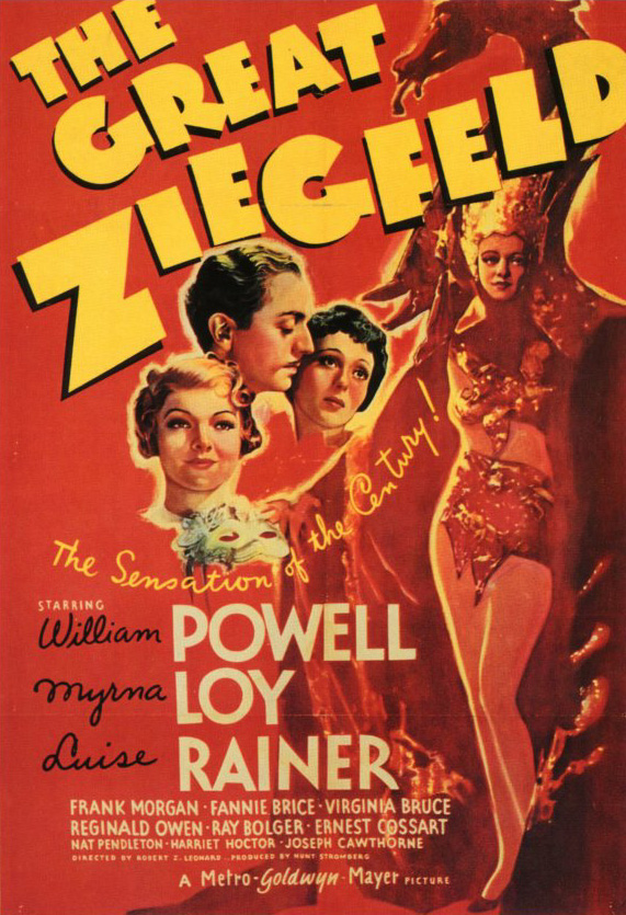 THE GREAT ZIEGFELD (1936) DIR Robert Z. Leonard PROD Hunt Stromberg SCR William Anthony McGuire (suggested by the life of Florenz Ziegfeld, Jr. [1867-1932]) CAM Oliver T. Marsh. ED William S. Gray MUS Arthur Lange CAST William Powell (Florenz Ziegfeld, Jr.), Myrna Loy (Billie Burke), Luise Rainer (Anna Held Ziegfeld), Frank Morgan (Jack Billings), Fanny Brice (herself), Virginia Bruce (Audrey Dane)