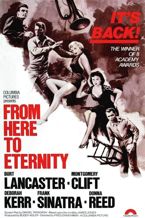 FROM HERE TO ETERNITY (1953) DIR Fred Zinnemann PROD Buddy Adler SCR Daniel Taradash (novel by James Jones) CAM Burnett Guffey MUS George Duning ED William Lyon CAST Burt Lancaster, Montgomery Clift, Deborah Kerr, Donna Reed, Frank Sinatra, Philip Ober, Mickey Shaughnessey, Ernest Borgnine, Jack Warden, Claude Akins, George Reeves