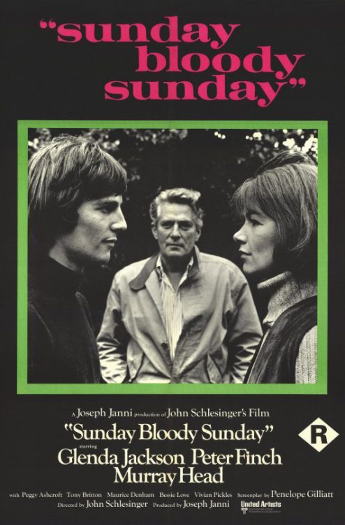 SUNDAY, BLOODY SUNDAY (1971) DIR John Schlesinger PROD Joseph Janni SCR John Schlesinger, Penelope Gilliatt, David Sherwin CAM Billy Williams ED Richard Marden MUS Ron Geesin CAST Glenda Jackson, Peter Finch, Murray Head, Peggy Ashcroft, Vivian Pickles, Frank Windsor, Thomas Baptiste, Emma Schlesinger