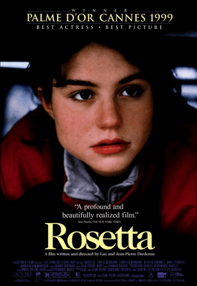 ROSETTA (1999) DIR – SCR Jean-Pierre Dardenne, Luc Dardenne PROD Jean-Pierre Dardenne, Luc Dardenne, Arlette Zylberberg, Laurent Pétin, Michèle Pétin CAM Alain Marcoen ED Marie-Hélène Dozo MUS Jean-Pierre Cocco CAST Émilie Dequenne (Rosetta), Fabrizio Rongione, Anne Yernaux, Olivier Gourmet, Bernard Marbaix, Frédéric Bodson