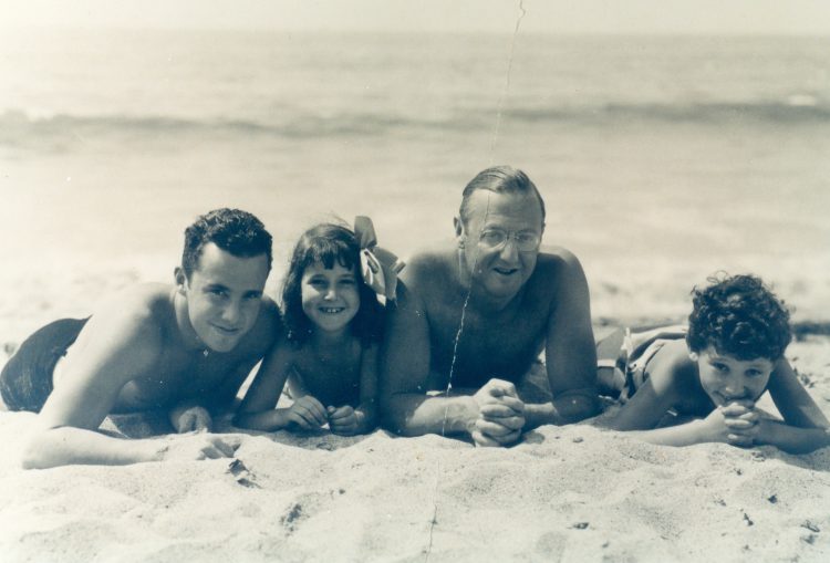 This old black and white still from Betty Lasky’s family album was taken by her mother Bessie, ca. 1930, Santa Monica beach, near their beach home. Jesse L. Lasky and his three children, Jesse Jr., Betty, and William, are enjoying the warm, bright and carefree Southern California sunshine. Lasky was one of Hollywood’s earliest visionary film pioneers who also shot the first feature film in Hollywood, “The Squaw Man” (1914), which you can watch entirely here.
