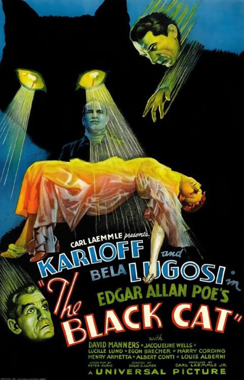 THE BLACK CAT (1934) DIR Edgar G. Ulmer PROD Carl Laemmle, Jr. SCR Peter Ruric (story by Edgar G. Ulmer, Peter Ruric) ED Ray Curtiss MUS Heinz Roemheld CAST Boris Karloff, Bela Lugosi (Dr. Vitus Werdegast), David Manners, Julie Bishop, Egon Brecher, Harry Cording, Lucille Lund, Henry Armetta, Albert Cordi, King Baggott, John Carradine