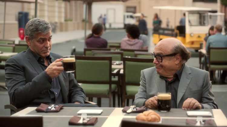 George Clooney and Danny DeVito having a Nespresso while shooting a movie in a Hollywood studio. Most amusing and entertaining.