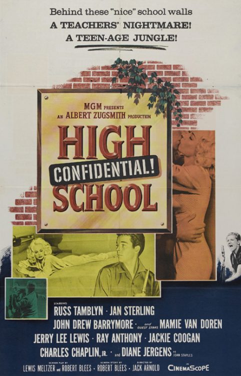 HIGH SCHOOL CONFIDENTIAL! (1958) DIR Jack Arnold PROD Albert Zugsmith SCR Lewis Meltzer, Robert Blees (story by Robert Blees) CAM Harold J. Marzorati ED Ben Lewis CAST Russ Tamblyn, Jan Sterling, John Drew Barrymore, Mamie Van Doren (Gwen Dulaine), Diane Jerges, Jerry Lee Lewis, Ray Anthony, Jackie Coogan, Charles Chaplin Jr., Lyle Talbot
