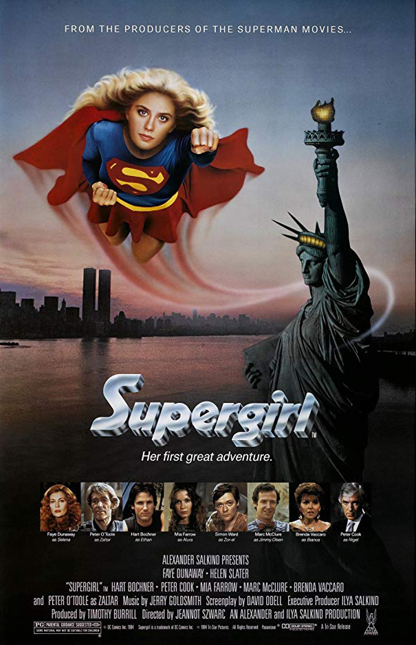 SUPERGIRL (1984) DIR Jeannot Szwarc PROD Timothy Burill SCR David Odell CAM Alan Hume ED Malcolm Cooke MUS Jerry Goldsmith CAST Helen Slater, Faye Dunaway, Peter O’Toole, Hart Bochner, Mia Farrow, Simon Ward, Marc McClure, Brenda Vaccaro, Peter Cook, Maureen Teefy, David Healy