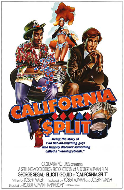 CALIFORNIA SPLIT (1974) DIR Robert Altman PROD Robert Altman, Joseph Walsh SCR Joseph Walsh CAM Paul Lohmann ED O. Nicholas Brown, Lou Lombardo CAST George Segal, Elliott Gould (Charlie Walters), Ann Prentiss, Gwen Welles, Edward Walsh, Joseph Walsh, Bert Remsen, Barbara London, Barbara Ruick, Jay Fletcher, Jeff Goldblum, Barbara Colby