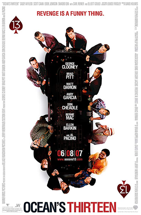 OCEAN’S THIRTEEN (2007) DIR Steven Soderberg PROD Jerry Weintraub SCR David Levien, Brian Koppelman (characters created by Jack Golden Russell, George Clayton Johnson) CAM Peter Andrews ED Stephen Mirrione MUS David Holmes CAST George Clooney, Brad Pitt, Matt Damon, Andy Garcia, Don Cheadle, Bernie Mac, Ellen Barkin, Al Pacino, Carl Reiner, Elliott Gould (Rueben Tishkoff), Shaobo Qin, Jerry Weintraub, Oprah Winfrey