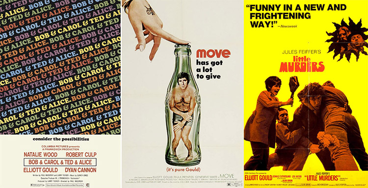 MOVE (1970) DIR Stuart Rosenberg PROD Pandro S. Berman SCR Joel Lieber, Stanley Hart (novel ‘Move’ [1968] by Joel Lieber) CAM William H. Daniels ED Rita Roland MUS Marvin Hamlish CAST Elliott Gould (Hiram Jaffe), Paula Prentiss, Geneviève Waïte, John Larch, Joe Silver, Graham Jarvis, Ron O’Neal, Garrie Bean, David Burns, Richard Bull, Jeannie Berlin