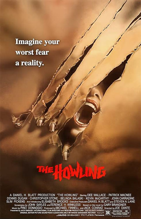 THE HOWLING (1981) DIR Joe Dante PROD Jack Conrad, Michael Finnell SCR John Sayles, Terence H. Winkless (novel ‘The Howling’ [1977] by Gary Bradner) CAM John Hora MUS Pino Donaggio ED Joe Dante, Mark Goldblatt CAST Dee Wallace (Karen White), Patrick Macnee, Dennis Dugan, Christopher Stone, Belinda Balaski, Kevin McCarthy, John Carradine, Slim Pickens, Elisabeth Brooks, Robert Picardo, Dick Miller, Roger Corman, John Sayles, Jonathan Kaplan