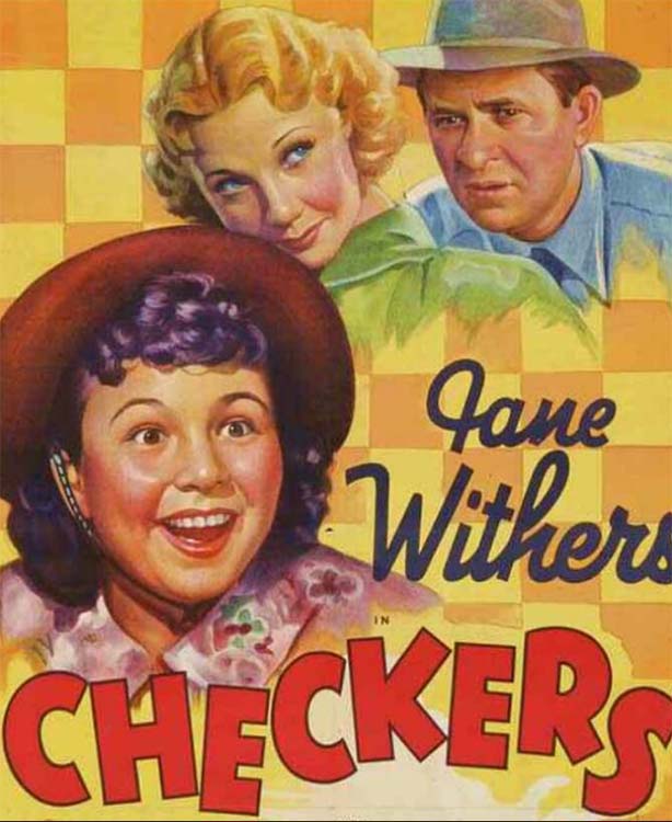 CHECKERS (1938) DIR H. Bruce Humberstone PROD John Stone SCR Lynn Root, Frank Fenton, Robert Chapin, Karen De Wolf (story by Lynn Root, Frank Fenton) CAM Daniel B. Clark ED Jack Murray MUS Samuel Kaylin CAST Jane Withers (Checkers Judy), Edgar Connell, Una Merkel, Marvin Stephens, Andrew Tombes, June Carlson, Francis Ford, Lon Chaney Jr.