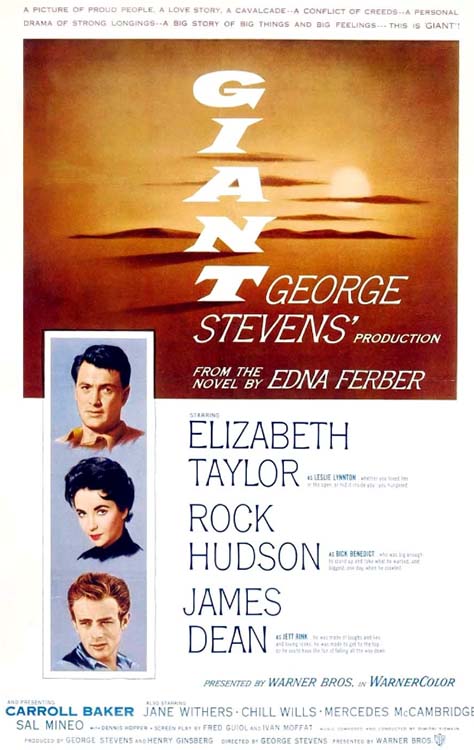 GIANT (1956) DIR George Stevens PROD George Stevens, Henry Ginsberg SCR Fred Guiol, Ivan Moffat (novel “Giant” [1952] by Edna Ferber) CAM William C. Mellor ED William Hornbeck, Robert Lawrence MUS Dimitri Tiomkin CAST Elizabeth Taylor, Rock Hudson, James Dean, Carroll Baker, Jane Withers (Vashti Snythe), Chill Wills, Mercedes McCambridge, Dennis Hopper, Sal Mineo, Rod Taylor, Judith Evelyn, Earl Holliman, Bess Flowers