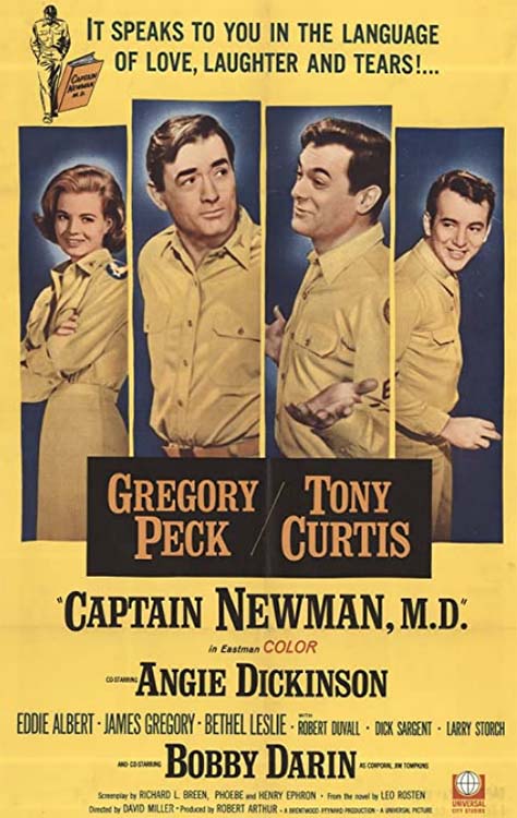 CAPTAIN NEWMAN, M.D. (1963) DIR David Miller PROD Robert Arthur, Gregory Peck [uncredited] SCR Henry Ephron, Phoebe Ephron, Richard L. Breen (novel “Captain Newman, M.D.” [1961] by Leo Rosten) CAM Russell Metty ED Alma Macrorie MUS Frank Skinner, Russell Garcia CAST Gregory Peck, Tony Curtis, Angie Dickinson, Eddie Albert, James Gregory, Bethel Leslie, Robert Duvall, Jane Withers (Lt. Grace Blodgett), Dick Sargent, Larry Storch, Bobby Darin