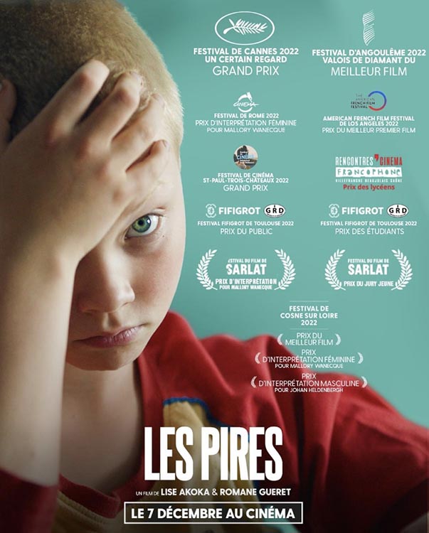 Since Cannes 2022, “Les pires” won several awards at film festivals such as the Cosne-Cours-sur-Loire Film Festival (best film debut; best leading actor, Johan Heldenbergh; best leading actress, Mallory Wanecque), the Festival du Film Francophone d’Angoulême (Valois de Diamant for best debut film), the Fifigrot Toulouse Film Festival (Prix du Public and Prix des Étudiants), the Festival de Cinéma de Saint-Paul Trois-Châteaux (Grand Prix), and abroad at the Rome Film Fest (best leading actress, Mallory Wanecque) en The American French Film Festival in Los Angeles (Best First Film).