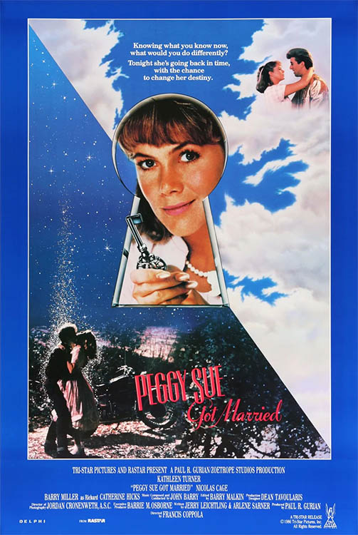 PEGGY SUE GOT MARRIED (1986) DIR Francis Ford Coppola PROD Paul R. Gurian SCR Arlene Sarner, Jerry Leichtling CAM Jordan Cronenweth ED Barry Malkin MUS John Barry CAST Kathleen Turner, Nicolas Cage, Barry Miller, Catherine Hicks, Joan Allen, Kevin J. O’Connor, Jim Carey, Lisa Jane Persky, Barbara Harris, Don Murray, Sofia Coppola, Maureen O’Sullivan, Leon Aames, Helen Hunt, John Carradine