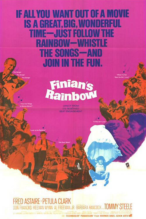 FINIAN’S RAINBOW (1968) DIR Francis Ford Coppola PROD Joseph Landon SCR Fred Saidy, E.Y. Harburg (Broadway play and book “Finian’s Rainbow” [1947] by Fred Saidy, E.Y. Harburg) CAM Philip H. Lathrop ED Melvin Shapiro MUS Ray Heindorf CAST Fred Astaire, Petula Clark, Tommy Steele, Don Francks, Keenan Wynn, Al Freeman Jr., Barbara Hancock, Dolph Sweet