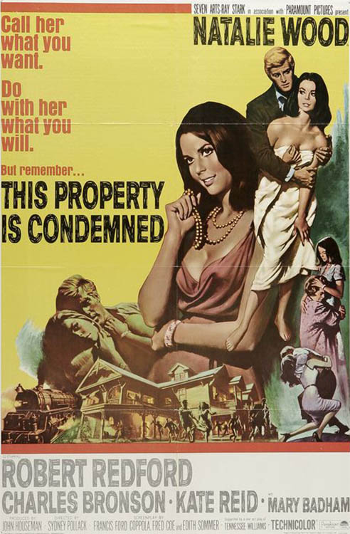 THIS PROPERTY IS CONDEMNED (1966) DIR Sydney Pollack PROD John Houseman, Ray Stark SCR Francis Ford Coppola, Fred Coe, Edith Sommer CAM Jameds Wong Howe ED Adrienne Fazan MUS Kenyon Hopkins CAST Natalie Wood, Robert Redford, Charles Bronson, Kate Reid, Mary Badham, Robert Blake, Dabney Coleman
