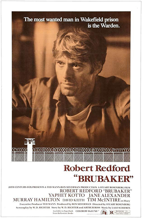 BRUBAKER (1980) DIR Stuart Rosenberg PROD Ron Silverman SCR W.D. Richter (story by W.D. Richter, Arthur A. Ross; book “Accomplices to the Crime: “The Arkansas Prison Scandal” [1969] by Joe Hyams, Thomas O. Murton) CAM Bruno Nuytten ED Robert Brown MUS Lalo Schifrin CAST Robert Redford, Yaphet Kotto, Jane Alexander, Murray Hamilton, David Keith, Morgan Freeman, Matt Clark, Tim McIntire, M. Emmet Walsh, Albert Salmi, Everett McGill, Val Avery