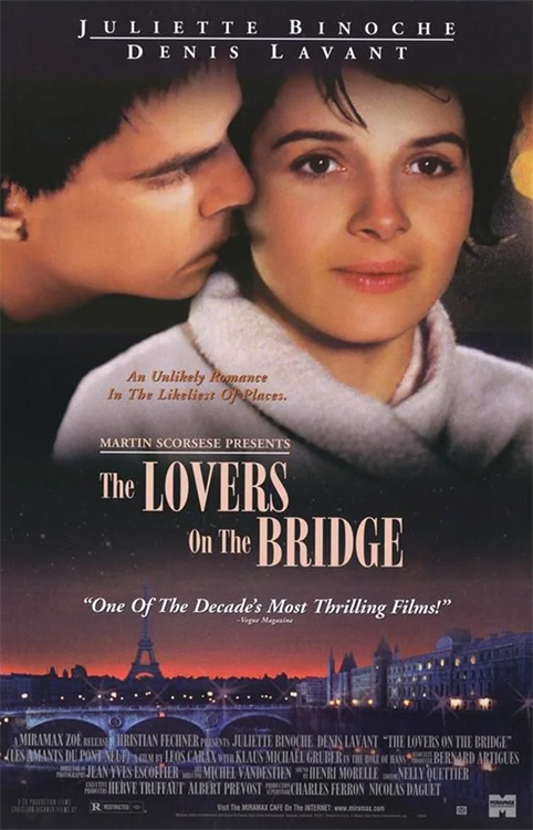 LES AMANTS DU PONT-NEUF, a.k.a. THE LOVERS ON THE BRIDGE (1991) DIR Leos Carax PROD Christian Fechner CAM Jean-Yves Escoffier ED Nelly Quettier CAST Juliette Binoche, Denis Lavant, Klaus-Michael Grüber, Marion Stalens, Chrichan Larsson, Paulette Berthonnier, Roger Berthonnier, Edith Scob, Georges Aperghis