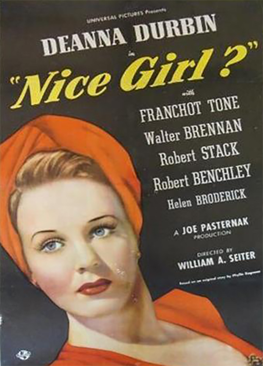 NICE GIRL? (1941) DIR William A. Seiter PROD Joe Pasternak SCR Gladys Lehman, Richard Connell (play “Nice Girl?” by Phyllis Duganne) CAM Joseph A. Valentine ED Bernard W. Burton MUS Frank Skinner CAST Deanna Durbin, Franchot Tone, Walter Brennan, Robert Stack, Robert Benchley, Helen Broderick, Ann Gillis (Nancy Dana), Tommy Kelly