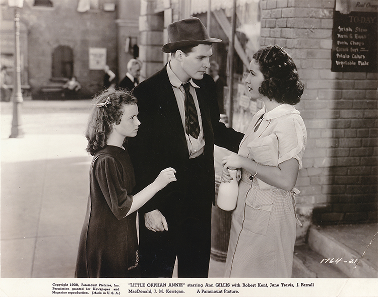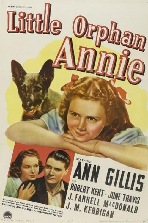 LITTLE ORPHAN ANNIE (1938) DIR Ben Holmes PROD John Speaks SCR Budd Schulberg, Samuel Ornitz (comic strip by Harold Gray; story by Samuel Ornitz, Endre Bohem) CAM Frank Redman ED Robert Bischoff MUS Joseph Nussbaum, Louis Forbes, George Bassman CAST Ann Gillis (Annie), Robert Kent, June Travis, J. Farrell MacDonald, J.M. Kerrigan, Margaret Armstrong, Sarah Padden, James Burke