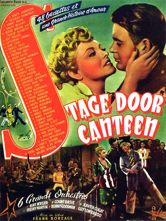 STAGE DOOR CANTEEN (1943) DIR Frank Borzage PROD Frank Borzage, Sol Lesser SCR Delmer Daves CAM Harry J. Wild MUS Freddie Rich CAST William Terry, Cheryl Walker, Judith Anderson, Kenny Baker, Tallulah Bankhead, Ralph Bellamy, Edgar Bergen, Charlie McCarthy, Ray Bolger, Ina Claire, Gracie Fields, Lynn Fontanne, Helen Hayes, Katharine Hepburn, Jean Hersholt, George Jessel, Alfred Lunt, Harpo Marx, Ethel Merman, Paul Muni, Merle Oberon, George Raft, Martha Scott, Ethel Waters, Johnny Weissmuller, Ed Wynn, Henry Armetta, Helen Broderick, Jane Darwell, William Demarest, Virginia Field, Ann Gillis (Ann Gillis), Virginia Grey, Sam Jaffe, Allen Jenkins, Otto Kruger, Helen Menken, Peggy Moran, Dame May Whitty, Count Basie, Xavier Cugat, Benny Goodman, Marjorie Riordan, Jean Louis Heydt, Gertrude Lawrence, Peggy Lee, Django Reinhardt, Ruth Roman