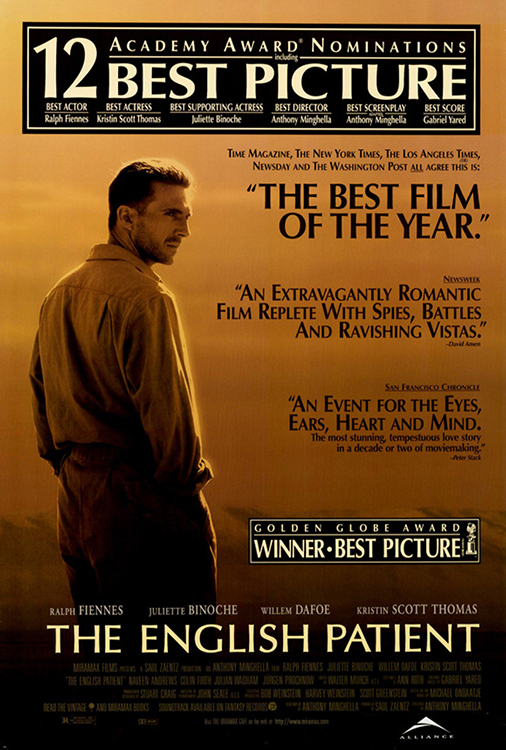 THE ENGLISH PATIENT (1996) DIR Anthony Minghella PROD Saul Zaentz SCR Anthony Minghella (novel “The English Patient” [1992] by Michael Ondaantje) CAM John Seale ED Walter Murch MUS Gabriel Yared CAST Ralph Fiennes, Juliette Binoche (Hana), Willem Dafoe, Kristin Scott Thomas, Naveen Andrews, Colin Firth, Julian Wadham, Jürgen Prochnow, Kevin Whately, Clive Merrison, Nino Castelnuovo, Hichem Rostom
