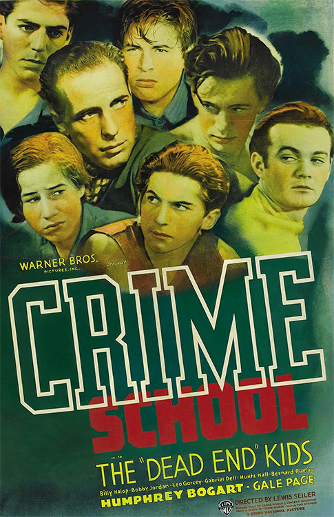 CRIME SCHOOL (1938) DIR Lewis Seiler SCR Vincent Sherman, Crane Wilbur (story by Crane Wilbur) CAM Arthur Todd ED Terry Morse MUS Max Steiner CAST Humphrey Bogart, The Dead End Kids, Gale Page, Billy Halop, Bobby Jordan, Huntz Hall, Leo Gorcey, Bernard Punsly, Gabriel Dell, George Offerman Jr.