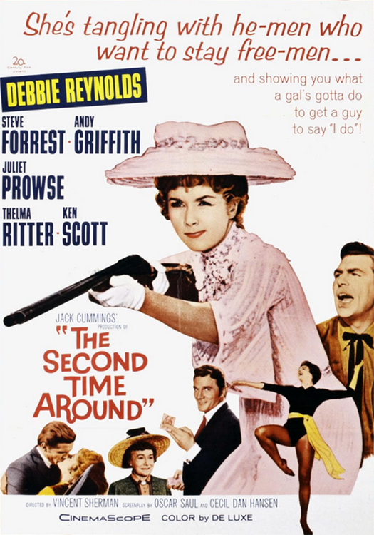 THE SECOND TIME AROUND (1961) DIR Vincent Sherman PROD Jack Cummings SCR Oscar Saul, Cecil Dan Hansen (novel “Star in the West” [1951] by Richard Emery Roberts) CAM Ellis W. Carter ED Betty Steinberg MUS Gerald Fried CAST Debbie Reynolds, Steve Forrest, Andy Griffith, Juliet Prowse, Thelma Ritter, Ken Scott