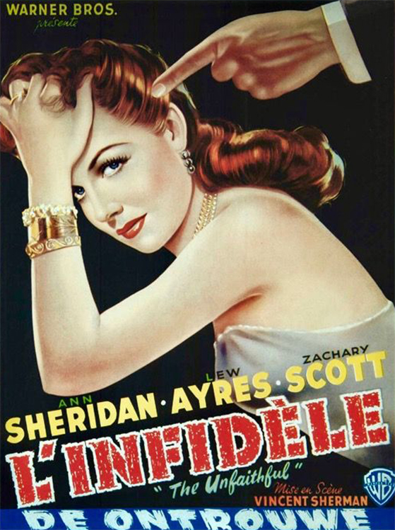 THE UNFAITHFUL (1947) DIR Vincent Sherman PROD Jerry Wald SCR David Goodis, James Gunn (novel by W. Somerset Maugham) CAM Ernest Haller ED Alan Crosland Jr. MUS Max Steiner CAST Ann Sheridan, Lew Ayres, Zachary Scott, Eve Arden, Jerome Cowan, Steven Geray, John Hoyt, Peggy Knudsen