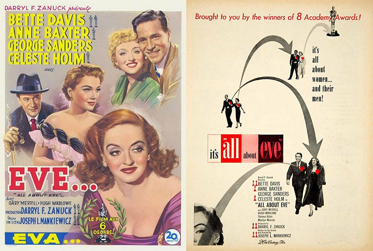 ALL ABOUT EVE (1950) DIR – SCR Joseph L. Mankiewicz PROD Darryl F. Zanuck CAM Milton Krasner ED Barbara McLean MUS Alfred Newman CAST Bette Davis (Margo Channing), Anne Baxter (Eve Harrington), George Sanders (Addison DeWitt), Celeste Holm (Karen), Gary Merrill (Bill Simpson), Hugh Marlowe (Lloyd Richards), Gregory Ratoff (Max Fabian), Thelma Ritter (Birdie), Marilyn Monroe (Miss Casswell), Barbara Bates (Phoebe)