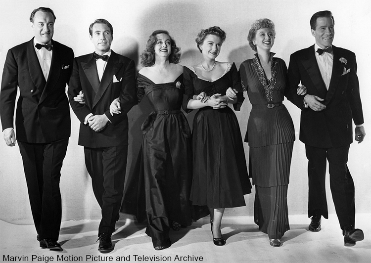 “All About Eve” received fourteen Oscar nominations—a record that remained unbroken until “Titanic” matched it in 1997—and won six: Best Picture, Best Director and Best Writing (both for Mankiewicz, after he had also won the same two Oscars the year before for “A Letter to Three Wives” [YouTube clip]), Best Supporting Actor (George Sanders), Best Costume Design (Edith Head, Charles Le Maire), and Best Sound (Thomas T. Moulton). Bette Davis and Anne Baxter were both nominated for Best Actress—the first time two actresses were nominated for starring roles in the same film—but the Oscar went to Judy Holiday for “Born Yesterday.” Celeste Holm and Thelma Ritter were nominated for Best Supporting Actress; they lost to Josephine Hull in “Harvey.”