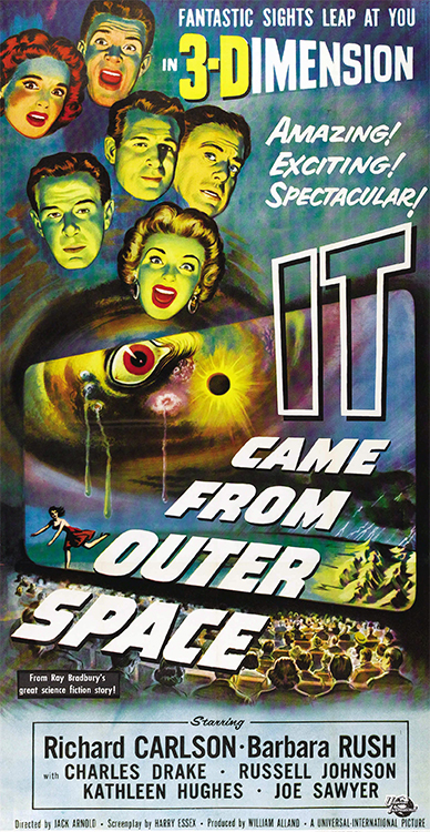 IT CAME FROM OUTER SPACE (1953) DIR Jack Arnold PROD William Alland SCR Harry Essex (film treatment “Atomic Monster” by Ray Bradbury) CAM Clifford Stine ED Paul Weatherwax MUS Henri Mancini, Herman Stein, Irving Gertz CAST Richard Carlson, Barbara Rush, Charles Drake, Russell Johnson, Kathleen Hughes (Jane), Joe Sawyer, Robert Carson, Edgar Dearing