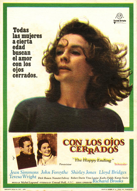 THE HAPPY ENDING (1969) DIR – PROD – SCR Richard Brooks CAM Conrad L. Hall ED George Grenville MUS Michel Legrand CAST Jean Simmons (Mary Wilson), John Forsythe, Shirley Jones, Lloyd Bridges, Teresa Wright, Dick Shawn, Nanette Fabray, Bobby Darin, Tina Louise, Kathy Fields, Karen Steele, Gail Hensley