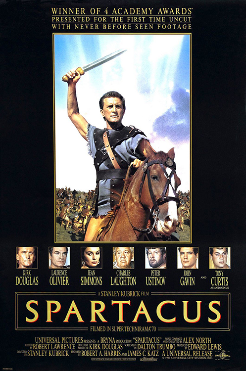 SPARTACUS (1960) DIR Stanley Kubrick PROD Edward Lewis [1991 restoration: James C. Katz] SCR Dalton Trumbo (novel “Spartacus” [1951] by Howard Fast) CAM Russell Metty ED Irving Lerner, Robert Lawrence MUS Alex North CAST Kirk Douglas, Laurence Olivier, Jean Simmons (Varinia), Charles Laughton, Peter Ustinov, John Gavin, Nina Foch, John Ireland, Herbert Lom, Charles MacGraw, Harold J. Stone, Woody Strode, Tony Curtis