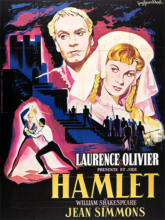 HAMLET (1948) DIR – PROD Laurence Olivier SCR Laurence Olivier (play “Hamlet” [between 1599-1601] by William Shakespeare) CAM Desmond Dickinson ED Helga Cranston MUS William Walton CAST Laurence Olivier, Eileen Herlie, Basil Sydney, Felix Aylmer, Jean Simmons (Ophelia), Stanley Holloway, Peter Cushing, John Gielgud, Patrick Macnee