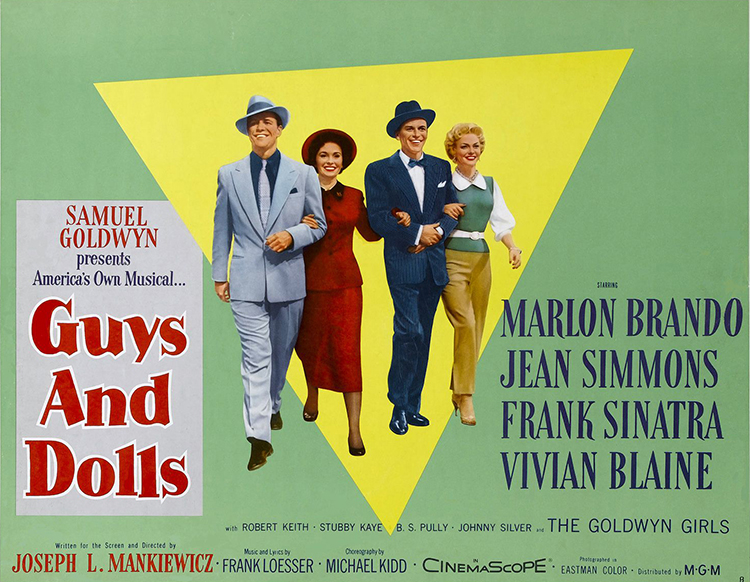 GUYS AND DOLLS (1955) DIR Joseph L. Manckiewicz PROD Samuel Goldwyn SCR Joseph L. Mankiewicz (short stories “The Idyll of Miss Sarah Brown” [1933] and “Blood Pressure” by Damon Runyon; Broadway musical “Guys and Dolls” [1950] by Jo Swerling, Abe Burrows) CAM Harry Stradling Sr. ED Daniel Mandell MUS Frank Loesser CAST Marlon Brando, Jean Simmons (Sarah Brown), Frank Sinatra, Vivian Blaine, Robert Keith, Stubby Kaye, Regis Toomey