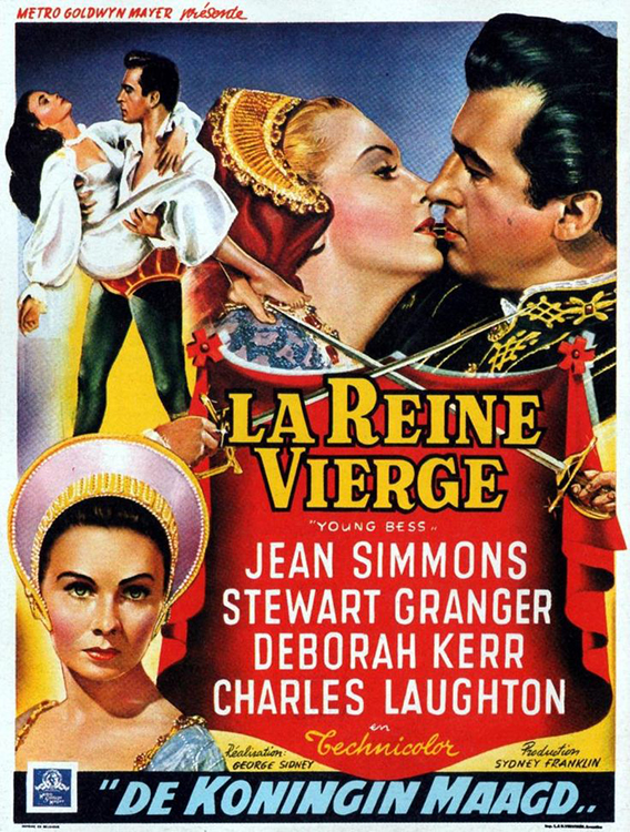 YOUNG BESS (1953) DIR George Sidney PROD Sidney Franklin SCR Jan Lustig, Arthur Wimperis (novel “Young Bess” [1944] by Margaret Irwin) CAM Charles Rosher ED Ralph E. Winters MUS Miklós Rózsa CAST Jean Simmons (Young Bess [Queen Elizabeth I]), Stewart Granger, Deborah Kerr, Charles Laughton, Kay Walsh, Guy Rolfe, Cecil Kellaway, Leo G. Carroll, Alan Napier, John Sheffield