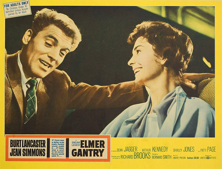 ELMER GANTRY (1960) DIR Richard Brooks PROD Bernard Smith SCR Richard Brooks (novel “Elmer Gantry” [1927] by Sinclair Brooks) CAM John Alton ED Marjorie Fowler MUS André Previn CAST Burt Lancaster, Jean Simmons (Sister Sharon Falconer), Arthur Kennedy, Dean Jagger, Shirley Jones, Patti Page, Edward Andrews, John McIntire, Hugh Marlowe