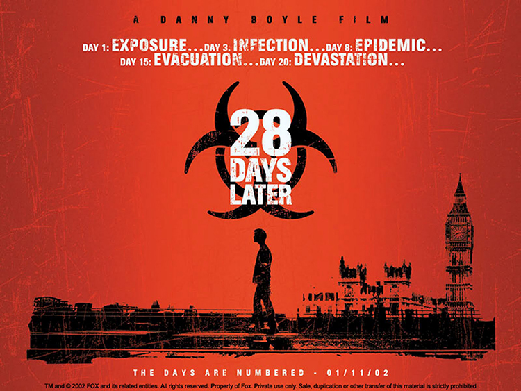 28 DAYS LATER (2002) DIR Danny Boyle PROD Andrew Macdonald SCR Alex Garland CAM Anthony Dod Mantle ED Chris Gill MUS John Murphy CAST Cillian Murphy, Naomie Harris, Christopher Eccleston, Megan Burns, Brendan Gleason, Toby Sedgwick, Christopher Dunne, Emma Hitching, Danny Boyle (Infected Running Across Minefield [uncredited])