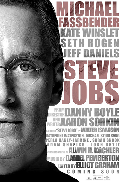 STEVE JOBS (2015) DIR Danny Boyle PROD Danny Boyle, Guymon Casady, Christian Colson, Mark Gordon SCR Aaron Sorkin (authorized self-titled biography “Steve Jobs” [2011] by Walter Isaacson) CAM Alwin H. Küchler ED Elliot Graham MUS Daniel Pemberton CAST Michael Fassbender, Kate Winslet, Seth Rogen, Jeff Daniels, Michael Stuhlbarg, Katherine Waterston