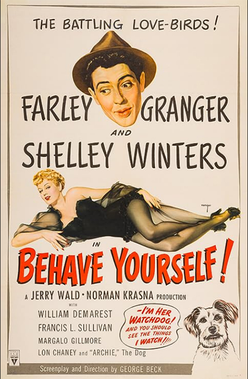 BEHAVE YOURSELF! (1951) DIR George Beck PROD Stanley Rubin SCR George Beck (story by George Beck, Frank Tarloff) CAM James Wong Howe ED Paul Weatherwax MUS Leigh Harline CAST Farley Granger, Shelley Winters, William Demarest, Francis L. Sullivan, Margalo Gillmore, Lon Chaney Jr., Hans Conried, Elisha Cook Jr., Glenn Anders, Sheldon Leonard, Kathleen Freeman, Vera Marshe