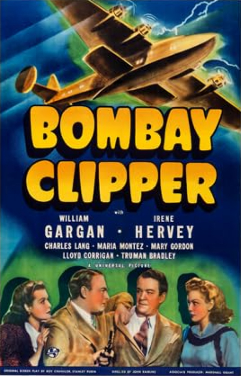 BOMBAY CLIPPER (1941) DIR John Rawlins ASSOC PROD Marshall Grant SCR Stanley Rubin, Roy Chanslor CAM Stanley Cortez ED Otto Ludwig CAST William Gargan, Irene Hervey, Charles Lang, Maria Montez, Mary Gordon, Lloyd Corrigan, Truman Bradley, Phillip Trent, Turhan Bey, John Bagni