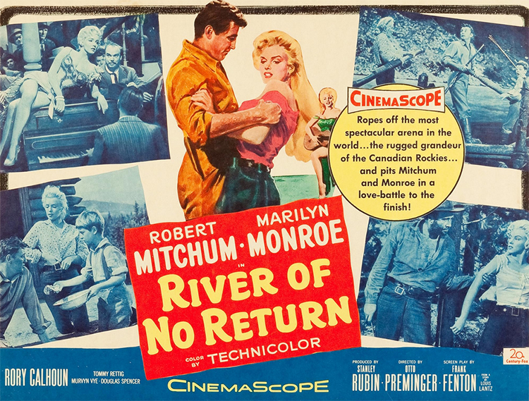RIVER OF NO RETURN (1954) DIR Otto Preminger PROD Stanley Rubin SCR Frank Fenton (story by Louis Lantz) CAM Joseph LaShelle ED Louis R. Loeffler MUS Cyril J. Mockridge CAST Robert Mitchum, Marilyn Monroe, Rory Calhoun, Tommy Rettig, Murvyn Vye, Douglas Spencer, Fred Aldrich, Claire Andre, Hal Baylor, Don Beddoe