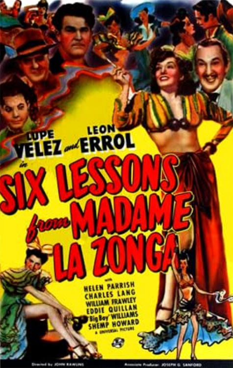 SIX LESSONS FROM MADAME LA ZONGA (1941) DIR John Rawlins ASSOC PROD Joseph Gersherson SCR Stanley Rubin, Ben Chapman, Larry Rhine, Marion Orth (original story by Ben Chapman, Larry Rhine) CAM John W. Boyle ED Edward Curtiss CAST Lupe Velez, Leon Errol, Helen Parrish, Charles Lang, William Frawley, Eddie Quillan, Guinn ‘Big Boy’ Williams, Shemp Howard, Frank Mitchell