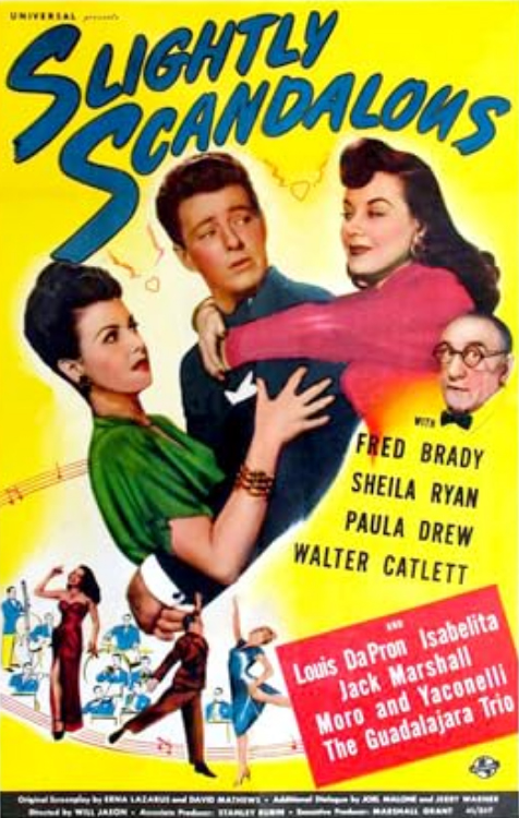 SLIGHTLY SCANDALOUS (1946) DIR Will Jason ASSOC PROD Stanley Rubin EXEC PROD Marshall Grant SCR Erna Lazarus, David Mathews CAM George Robinson ED Fred R. Feitshans Jr. CAST Fred Brady, Sheila Ryan, Paula Drew, Walter Catlett, Louis Da Pron, Isabelita [Lita Baron], Jack Marshall, Moro and Yaconelli [Nick Moro, Frank Yaconelli], The Guadalajara Trio