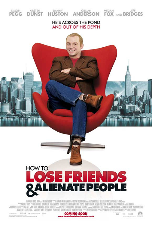 HOW TO LOSE FRIENDS & ALIENATE PEOPLE (2008) DIR Robert B. Weide PROD Elizabeth Karlsen, Stephen Woolley SCR Peter Straughan (memoir “How to Lose Friends & Alienate People” [2001] by Toby Young) CAM Oliver Stapleton ED David Freeman MUS David Arnold CAST Simon Pegg (Sidney Young), Kirsten Dunst, Danny Huston, Gillian Anderson, Megan Fox, James Bridges, Toni Collette, Daniel Craig, Ricky Gervais, Kate Winslet