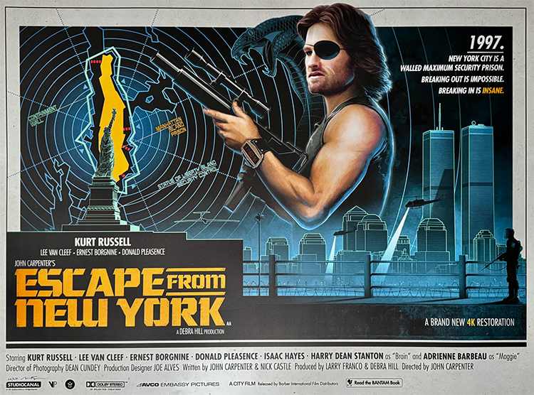 ESCAPE FROM NEW YORK (1981) DIR – MUS John Carpenter PROD Debra Hill, Larry Franco SCR John Carpenter, Nick Castle CAM Dean Cundey ED Todd C. Ramsay CAST Kurt Russell, Lee Van Cleef, Donald Pleasence, Ernest Borgnine, Isaac Hayes, Harry Dean Stanton, Adrienne Barbeau (Maggie), Season Hubley, Tom Atkins, Charles Cyphers, John Carpenter, Nick Castle, Jamie Lee Curtis (voice only), Debra Hill (voice only)
